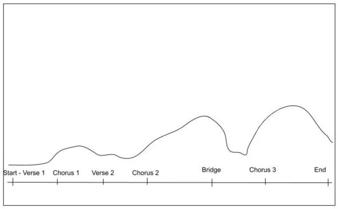Take it another step further by creating a song timeline. On a new sheet of paper or the back of your lyric sheet, draw a line from one end of the paper to the other. Mark zero at the start of the line on the left and the song’s duration at the end to the right. Next, mark the sections of the song on your timeline (i.e.: Verse 1, Chorus 1, Chorus 2, Bridge, etc). Now draw a contour of the songs dynamics across time above your timeline (see figure below).